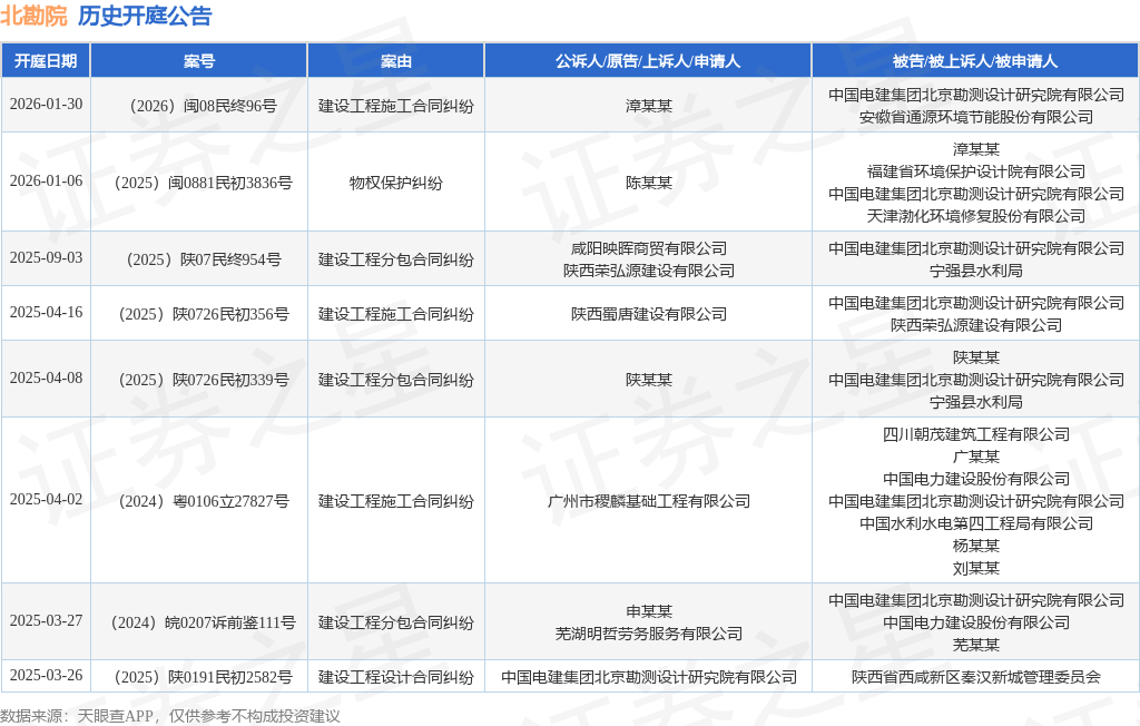 案号:(2026)闽08民终96号根据统计,近一年内以中国电建集团北京勘测设计研究院有限公司为当事人的历史开庭公告有8则,其中案由为“建设工程分包合同纠纷”的公告以3则居首,其次为“建设工程施工合同纠纷”有3则,“建设工程设计合同纠纷”有1则。历史开庭公告如下: