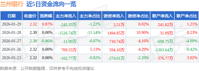 证券之星消息,截至2026年1月29日收盘,兰州银行(001227)报收于2.32元,上涨0.87%,换手率2.05%,成交量86.58万手,成交额2.01亿元。