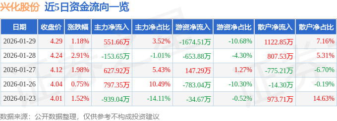 证券之星消息,截至2026年1月29日收盘,兴化股份(002109)报收于4.29元,上涨1.18%,换手率2.87%,成交量36.66万手,成交额1.57亿元。