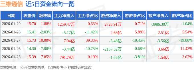 证券之星消息,截至2026年1月29日收盘,三维通信(002115)报收于15.7元,上涨1.88%,换手率32.18%,成交量242.05万手,成交额38.37亿元。