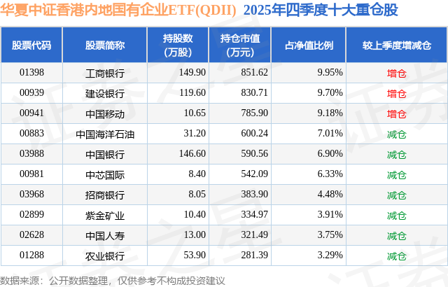 华夏中证香港内地国有企业ETF(QDII)基金成立于2023年8月21日,基金经理为华龙,基金跟踪标的为中证香港内地国有企业港元指数,成立以来超额回报为3.14%,近一个月超额回报为-0.18%。最新披露的基金持仓数据显示,截止2025年12月31日,该基金第一大重仓股为工商银行(01398),持股占比为9.95%。