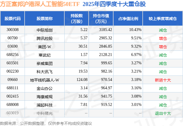 方正富邦沪港深人工智能50ETF基金成立于2021年8月4日,基金经理为吴昊 徐维君,基金跟踪标的为中证沪港深人工智能50人民币指数,成立以来超额回报为-15.94%,近一个月超额回报为0.18%。最新披露的基金持仓数据显示,截止2025年12月31日,该基金第一大重仓股为中际旭创(300308),持股占比为10.43%。