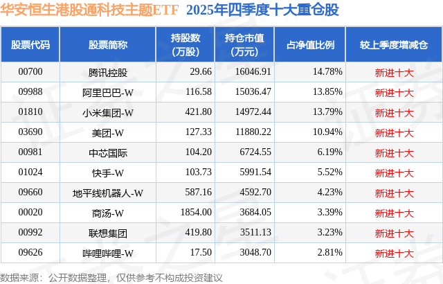 华安恒生港股通科技主题ETF基金成立于2025年8月14日,基金经理为王超,基金跟踪标的为恒生港股通科技主题指数,成立以来超额回报为-2.41%,近一个月超额回报为-0.68%。最新披露的基金持仓数据显示,截止2025年12月31日,该基金第一大重仓股为腾讯控股(00700),持股占比为14.78%。