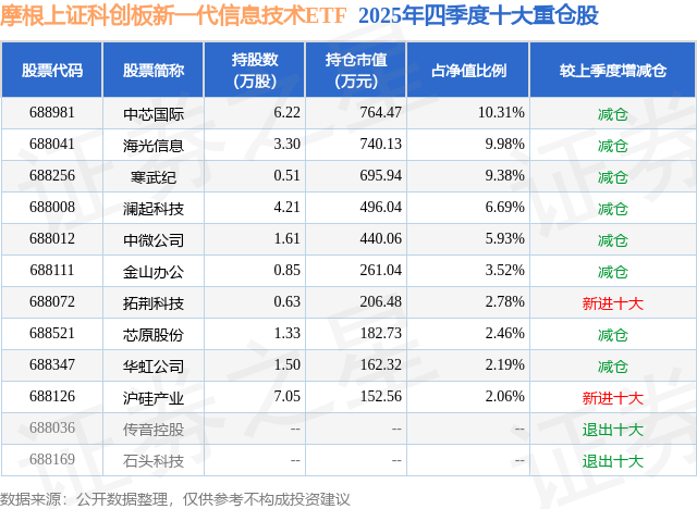 摩根上证科创板新一代信息技术ETF基金成立于2025年3月14日,基金经理为何智豪 曲蕾蕾,基金跟踪标的为上证科创板新一代信息技术指数,成立以来超额回报为4.07%,近一个月超额回报为-0.14%。最新披露的基金持仓数据显示,截止2025年12月31日,该基金第一大重仓股为中芯国际(688981),持股占比为10.31%。