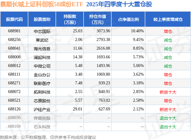 景顺长城上证科创板50成份ETF基金成立于2025年1月15日,基金经理为龚丽丽 金璜,基金跟踪标的为上证科创板50成份指数,成立以来超额回报为2.29%,近一个月超额回报为0.08%。最新披露的基金持仓数据显示,截止2025年12月31日,该基金第一大重仓股为中芯国际(688981),持股占比为10.4%。