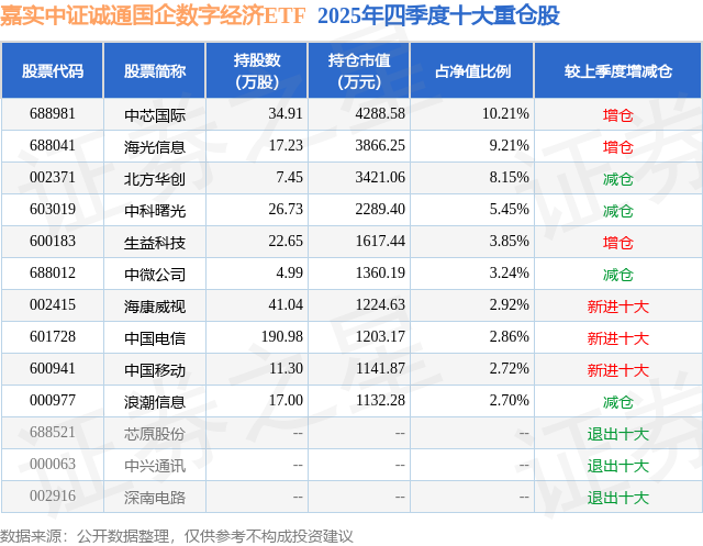 嘉实中证诚通国企数字经济ETF基金成立于2025年5月22日,基金经理为尚可,基金跟踪标的为中证诚通国企数字经济指数,成立以来超额回报为1.74%,近一个月超额回报为0.13%。最新披露的基金持仓数据显示,截止2025年12月31日,该基金第一大重仓股为中芯国际(688981),持股占比为10.21%。