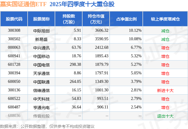 嘉实国证通信ETF基金成立于2023年4月27日,基金经理为张钟玉,基金跟踪标的为国证通信指数,成立以来超额回报为2.49%,近一个月超额回报为0.11%。最新披露的基金持仓数据显示,截止2025年12月31日,该基金第一大重仓股为中际旭创(300308),持股占比为10.12%。