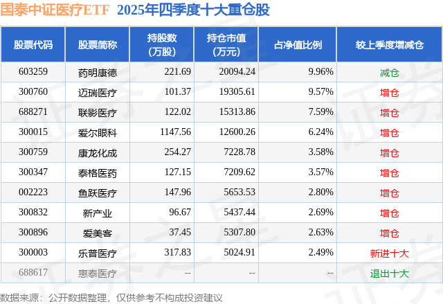 国泰中证医疗ETF基金成立于2020年12月24日,基金经理为梁杏 黄岳,基金跟踪标的为中证医疗指数,成立以来超额回报为-0.55%,近一个月超额回报为0.02%。最新披露的基金持仓数据显示,截止2025年12月31日,该基金第一大重仓股为药明康德(603259),持股占比为9.96%。