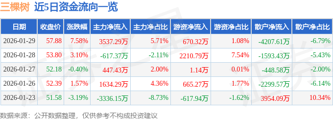 证券之星消息,截至2026年1月29日收盘,三棵树(603737)报收于57.88元,上涨7.58%,换手率1.47%,成交量10.86万手,成交额6.2亿元。