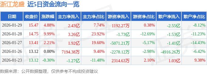 证券之星消息,截至2026年1月29日收盘,浙江龙盛(600352)报收于15.47元,上涨4.88%,换手率6.35%,成交量206.58万手,成交额31.38亿元。
