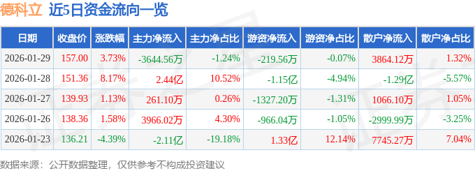 证券之星消息,截至2026年1月29日收盘,德科立(688205)报收于157.0元,上涨3.73%,换手率11.64%,成交量18.43万手,成交额29.29亿元。