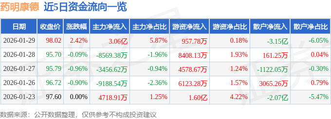 证券之星消息,截至2026年1月29日收盘,药明康德(603259)报收于98.02元,上涨2.42%,换手率2.17%,成交量53.56万手,成交额52.07亿元。