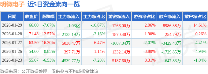 证券之星消息,截至2026年1月29日收盘,明微电子(688699)报收于66.0元,下跌7.67%,换手率8.15%,成交量8.98万手,成交额6.15亿元。