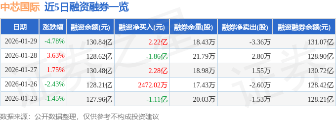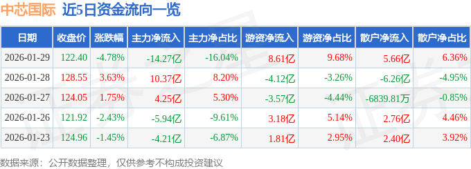 证券之星消息,截至2026年1月29日收盘,中芯国际(688981)报收于122.4元,下跌4.78%,换手率3.58%,成交量71.56万手,成交额88.97亿元。