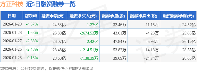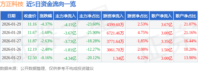 证券之星消息,截至2026年1月29日收盘,方正科技(600601)报收于11.16元,下跌4.37%,换手率3.66%,成交量152.64万手,成交额17.4亿元。
