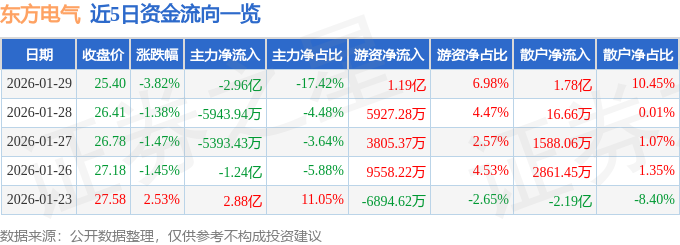 证券之星消息,截至2026年1月29日收盘,东方电气(600875)报收于25.4元,下跌3.82%,换手率2.91%,成交量65.8万手,成交额16.99亿元。