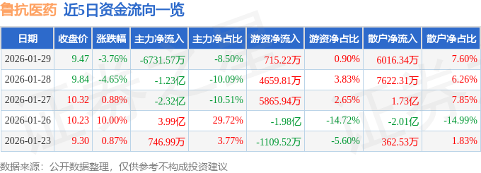 证券之星消息,截至2026年1月29日收盘,鲁抗医药(600789)报收于9.47元,下跌3.76%,换手率9.27%,成交量83.31万手,成交额7.92亿元。