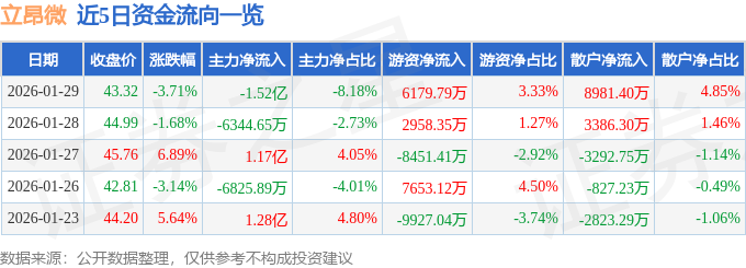 1月29日的资金流向数据方面,主力资金净流出1.52亿元,占总成交额8.18%,游资资金净流入6179.79万元,占总成交额3.33%,散户资金净流入8981.4万元,占总成交额4.85%。