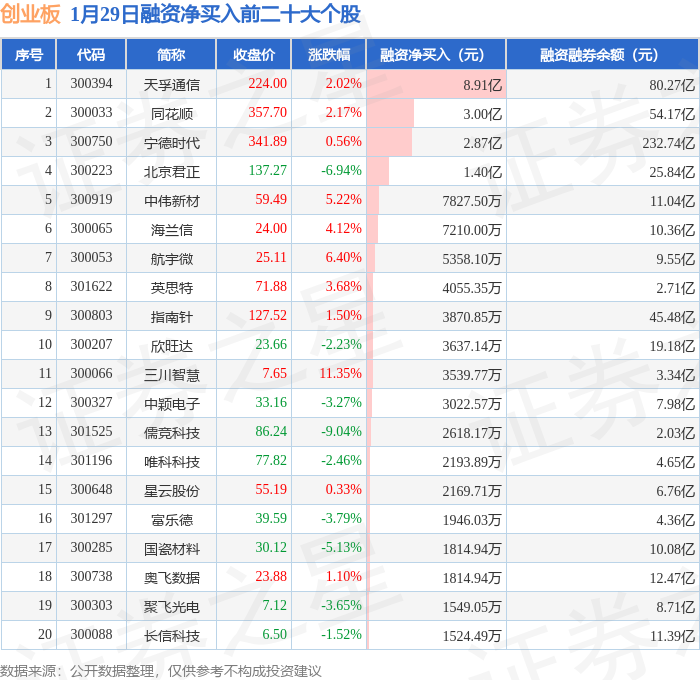 创业板融资净买入前三分别为:天孚通信(300394)融资净买入8.91亿元、同花顺(300033)融资净买入3亿元、宁德时代(300750)融资净买入2.87亿元,前20具体见下表: