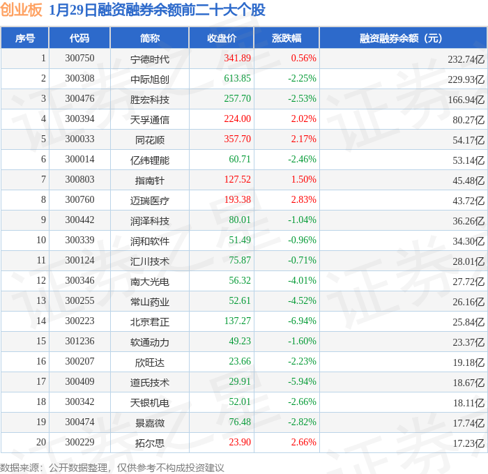 创业板融资融券余额前三分别为:宁德时代(300750)融资融券余额232.74亿元、中际旭创(300308)融资融券余额229.93亿元、胜宏科技(300476)融资融券余额166.94亿元,前20具体见下表: