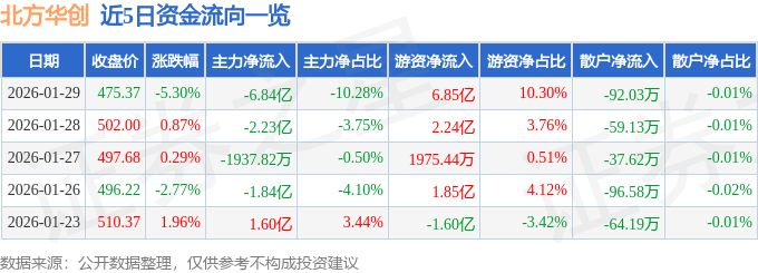 证券之星消息,截至2026年1月29日收盘,北方华创(002371)报收于475.37元,下跌5.3%,换手率1.91%,成交量13.81万手,成交额66.54亿元。