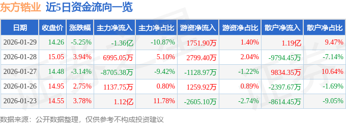 证券之星消息,截至2026年1月29日收盘,东方锆业(002167)报收于14.26元,下跌5.25%,换手率11.43%,成交量86.57万手,成交额12.52亿元。