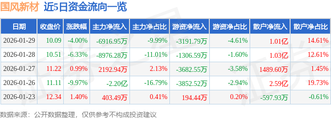 证券之星消息,截至2026年1月29日收盘,国风新材(000859)报收于10.09元,下跌4.0%,换手率7.53%,成交量67.5万手,成交额6.92亿元。