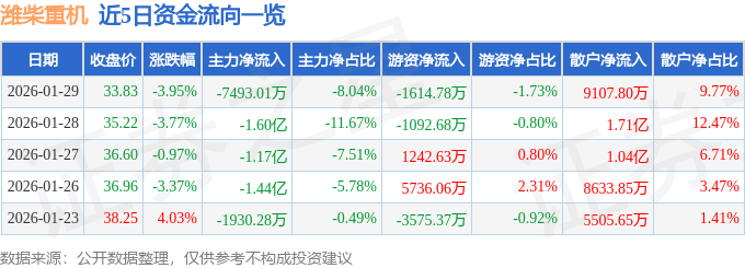 证券之星消息,截至2026年1月29日收盘,潍柴重机(000880)报收于33.83元,下跌3.95%,换手率12.03%,成交量27.32万手,成交额9.32亿元。