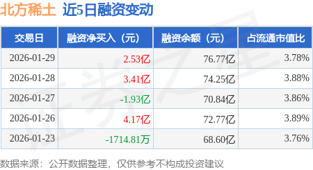 证券之星消息,1月29日,北方稀土(600111)融资买入24.86亿元,融资偿还22.33亿元,融资净买入2.53亿元,融资余额76.77亿元,当日融资净买入排名第12。