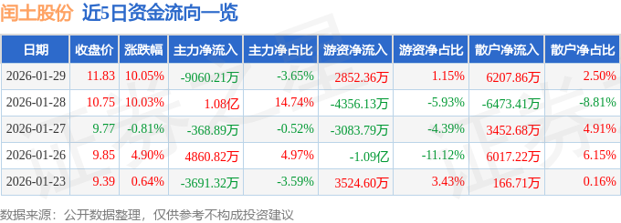 证券之星消息,截至2026年1月29日收盘,闰土股份(002440)报收于11.83元,上涨10.05%,已连续涨停2天,换手率22.95%,成交量217.16万手,成交额24.8亿元。