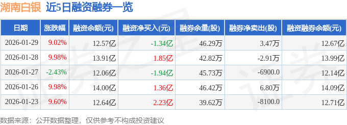 证券之星消息,截至2026年1月29日收盘,湖南白银(002716)报收于21.15元,上涨9.02%,换手率25.03%,成交量581.83万手,成交额118.76亿元。