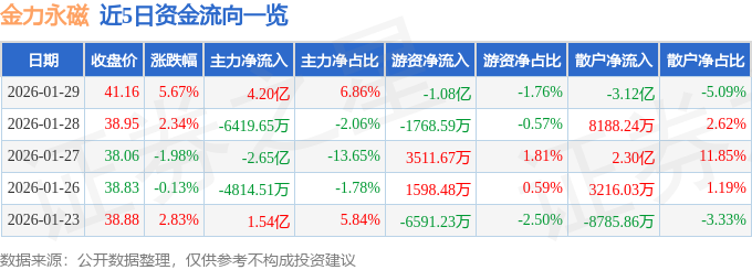 证券之星消息,截至2026年1月29日收盘,金力永磁(300748)报收于41.16元,上涨5.67%,换手率13.29%,成交量150.32万手,成交额61.3亿元。