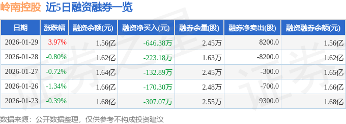 岭南控股融资融券信息显示,融资方面,当日融资买入2444.06万元,融资偿还3090.44万元,融资净偿还646.38万元。融券方面,融券卖出8500.0股,融券偿还300.0股,融券余量2.45万股,融券余额31.46万元。融资融券余额1.56亿元。