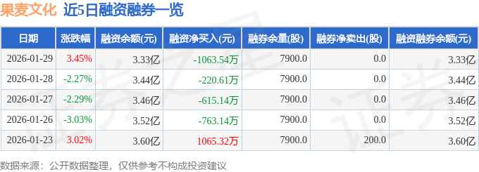 果麦文化融资融券信息显示,融资方面,当日融资买入3904.0万元,融资偿还4967.55万元,融资净偿还1063.54万元。融券方面,融券卖出0.0股,融券偿还0.0股,融券余量7900.0股,融券余额32.0万元。融资融券余额3.33亿元。