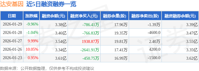 证券之星消息,截至2026年1月29日收盘,达安基因(002030)报收于6.87元,下跌9.96%,跌停,换手率12.64%,成交量177.37万手,成交额12.38亿元。