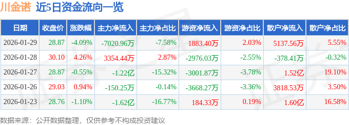 证券之星消息,截至2026年1月29日收盘,川金诺(300505)报收于28.87元,下跌4.09%,换手率14.6%,成交量31.74万手,成交额9.26亿元。