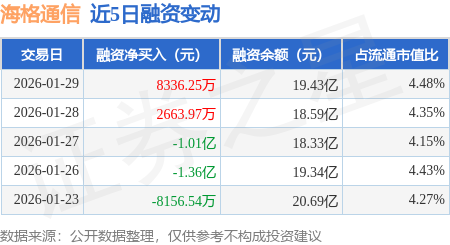 证券之星消息,1月29日,海格通信(002465)融资买入4.41亿元,融资偿还3.58亿元,融资净买入8336.25万元,融资余额19.43亿元。