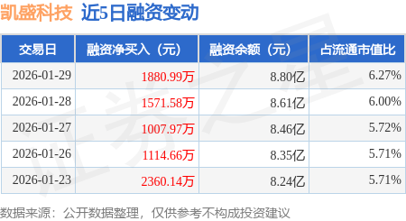 证券之星消息,1月29日,凯盛科技(600552)融资买入1.06亿元,融资偿还8752.34万元,融资净买入1880.99万元,融资余额8.8亿元,近3个交易日已连续净买入累计4460.53万元,近20个交易日中有11个交易日出现融资净买入。