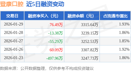 证券之星消息,1月29日,登康口腔(001328)融资买入689.39万元,融资偿还612.9万元,融资净买入76.49万元,融资余额3315.64万元。