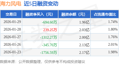 证券之星消息,1月29日,海力风电(301155)融资买入1620.65万元,融资偿还2315.25万元,融资净卖出694.6万元,融资余额1.96亿元。
