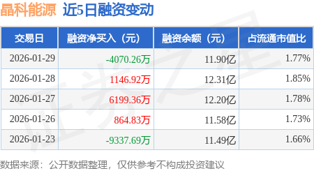 证券之星消息,1月29日,晶科能源(688223)融资买入1.8亿元,融资偿还2.21亿元,融资净卖出4070.26万元,融资余额11.9亿元,近20个交易日中有14个交易日出现融资净买入。