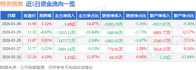 证券之星消息,截至2026年1月30日收盘,特发信息(000070)报收于11.9元,上涨5.12%,换手率9.87%,成交量87.74万手,成交额10.27亿元。