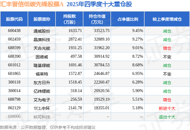 根据2025基金年报公募基金重仓股数据,重仓该股的公募基金共4家,其中持有数量最多的公募基金为汇丰晋信基金的汇丰晋信低碳先锋股票A。汇丰晋信低碳先锋股票A目前规模为31.61亿元,最新净值3.0422(1月29日),较上一交易日下跌0.55%,近一年上涨45.62%。该公募基金现任基金经理为陆彬。陆彬在任的基金产品包括:汇丰晋信智造先锋股票A,管理时间为2019年5月18日至今,期间收益率为235.51%;汇丰晋信动态策略混合A,管理时间为2020年5月9日至今,期间收益率为106.42%;汇丰晋信核心成长A,管理时间为2021年5月24日至今,期间收益率为5.5%。
