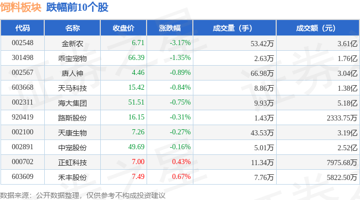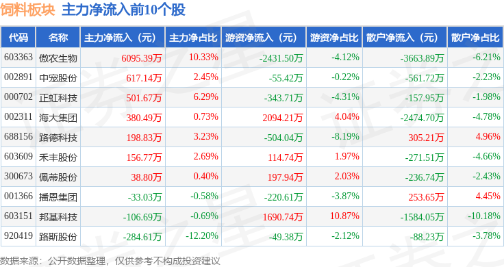 从资金流向上来看,当日饲料板块主力资金净流出6879.49万元,游资资金净流入8426.02万元,散户资金净流出1546.52万元。饲料板块个股资金流向见下表: