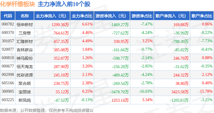 从资金流向上来看,当日化学纤维板块主力资金净流出3.88亿元,游资资金净流出3166.92万元,散户资金净流入4.2亿元。化学纤维板块个股资金流向见下表: