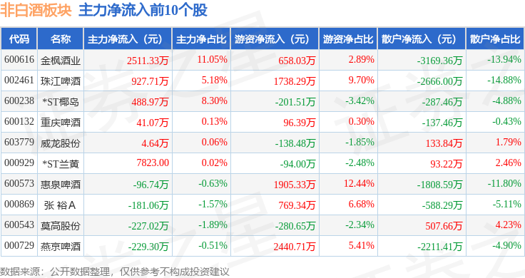 从资金流向上来看,当日非白酒板块主力资金净流出1.43亿元,游资资金净流入1.2亿元,散户资金净流入2255.15万元。非白酒板块个股资金流向见下表: