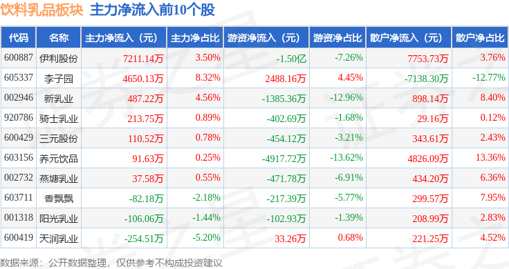 从资金流向上来看,当日饮料乳品板块主力资金净流出1.32亿元,游资资金净流出2.2亿元,散户资金净流入3.51亿元。饮料乳品板块个股资金流向见下表: