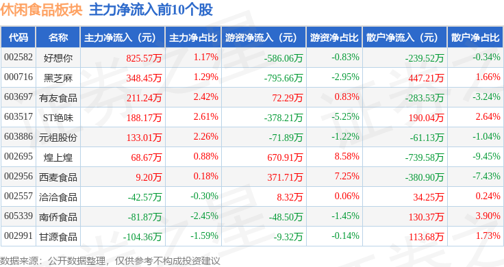 从资金流向上来看,当日休闲食品板块主力资金净流出1.01亿元,游资资金净流入611.52万元,散户资金净流入9489.4万元。休闲食品板块个股资金流向见下表: