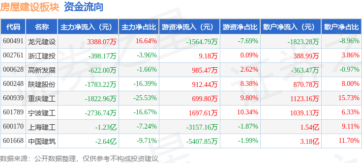 从资金流向上来看,当日房屋建设板块主力资金净流出4.26亿元,游资资金净流出5825.3万元,散户资金净流入4.84亿元。房屋建设板块个股资金流向见下表: