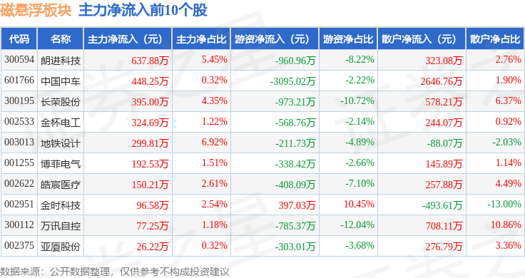 从资金流向上来看,当日磁悬浮板块主力资金净流出24.17亿元,游资资金净流入2.61亿元,散户资金净流入21.56亿元。磁悬浮板块个股资金流向见下表: